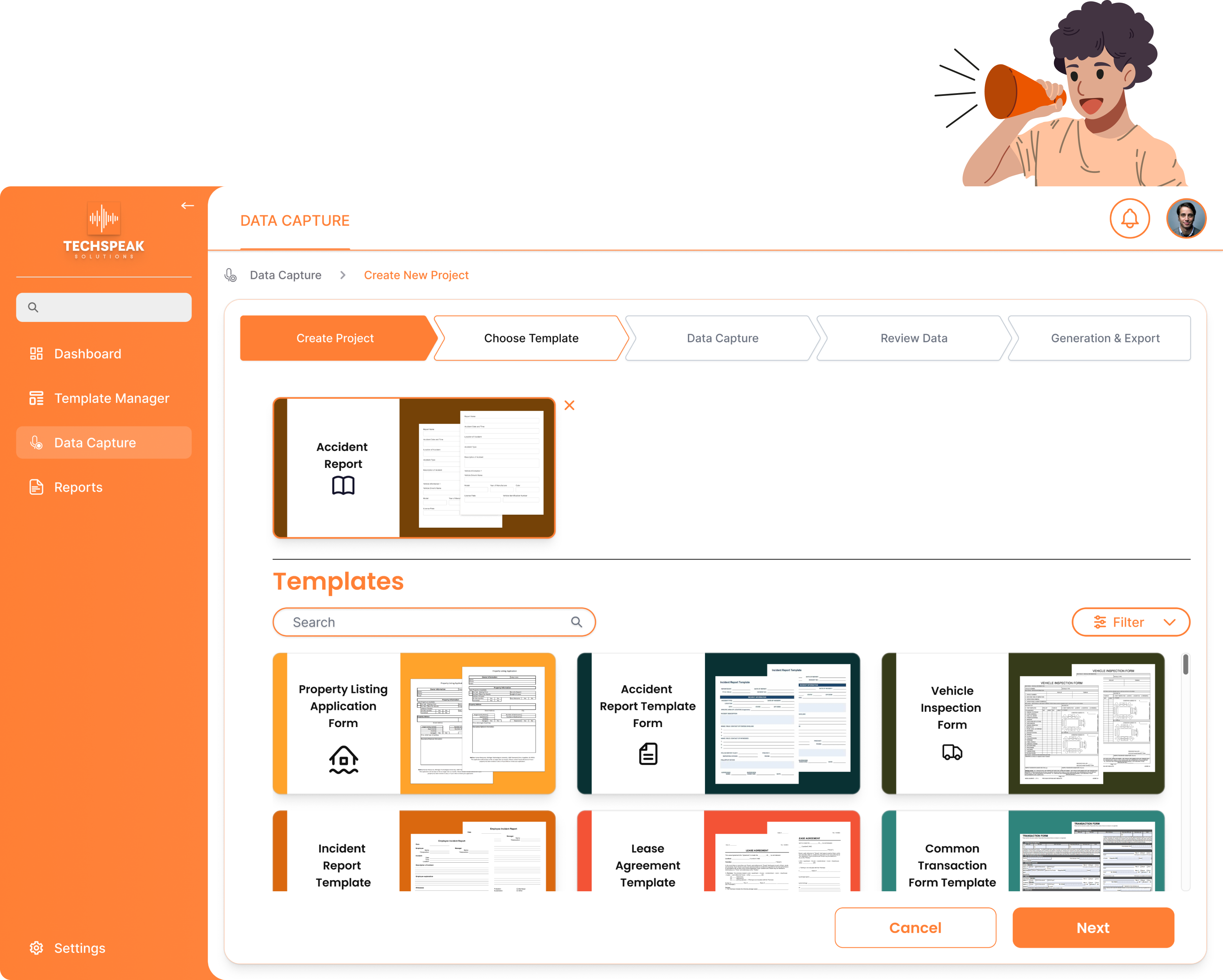 Select a template to match your needs. You can either create a custom template or let our AI generate one for you. Templates cover various use cases like accident reports and vehicle inspection forms etc., helping you streamlining your data capture process.